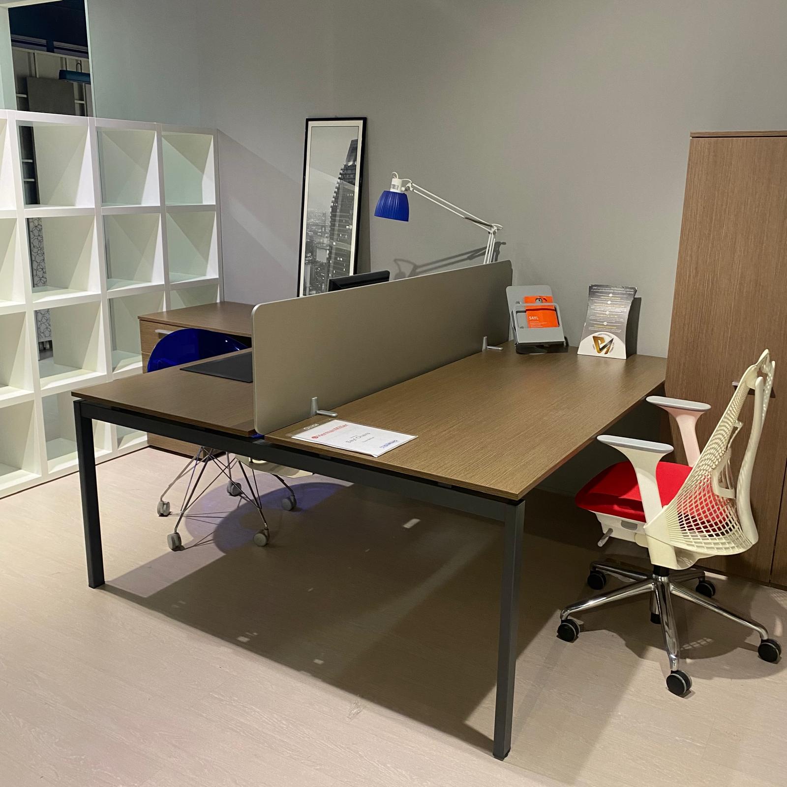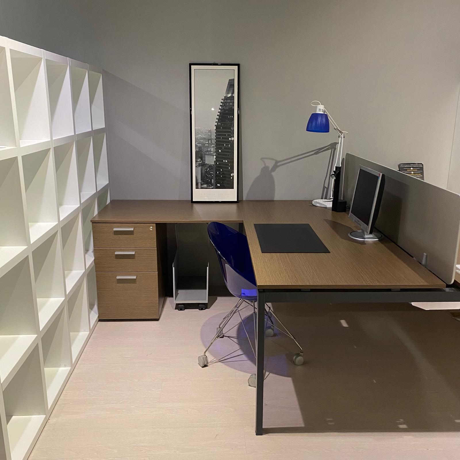 Scrivania due postazioni con cassettiera e dattilo in rovere tabacco e struttura antracite.