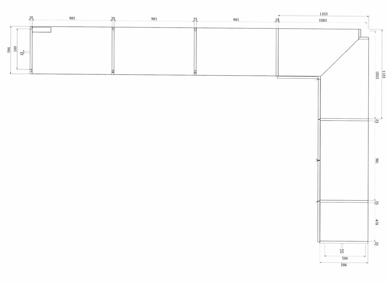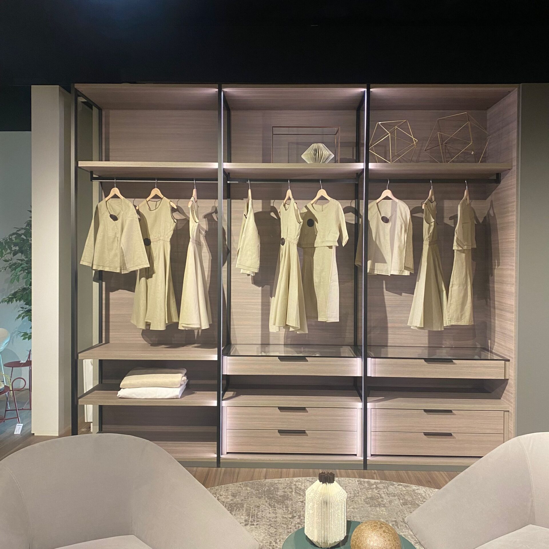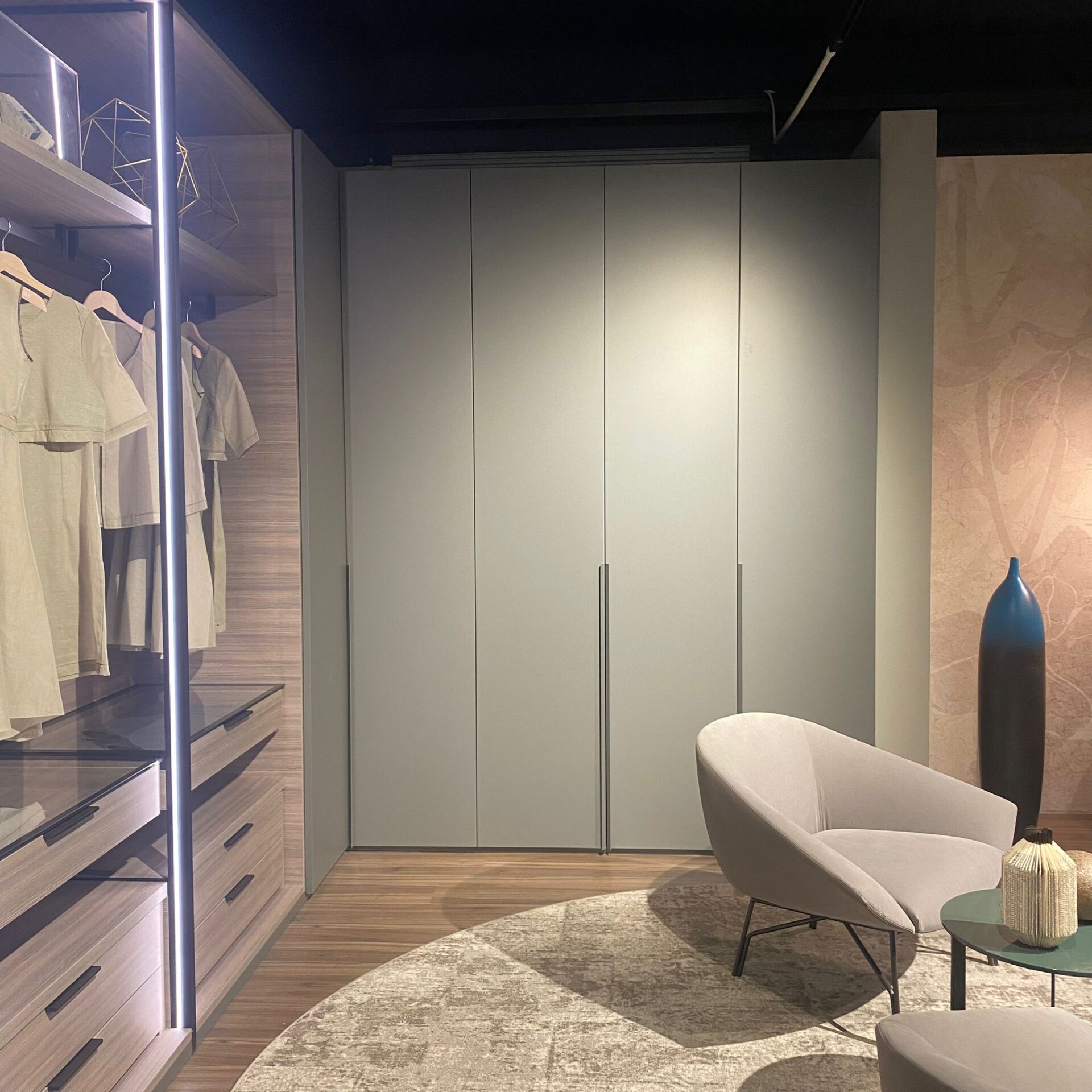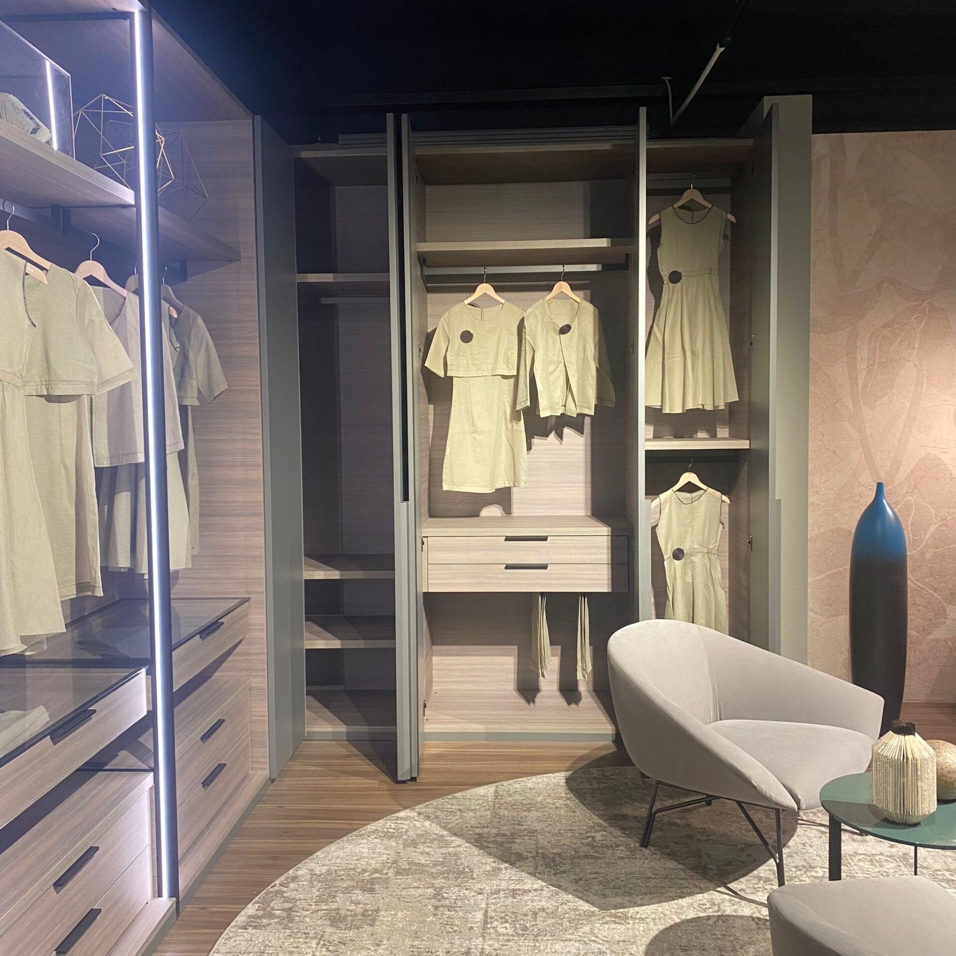 Armadio ad angolo Open con fianchi passanti e cassettiere.