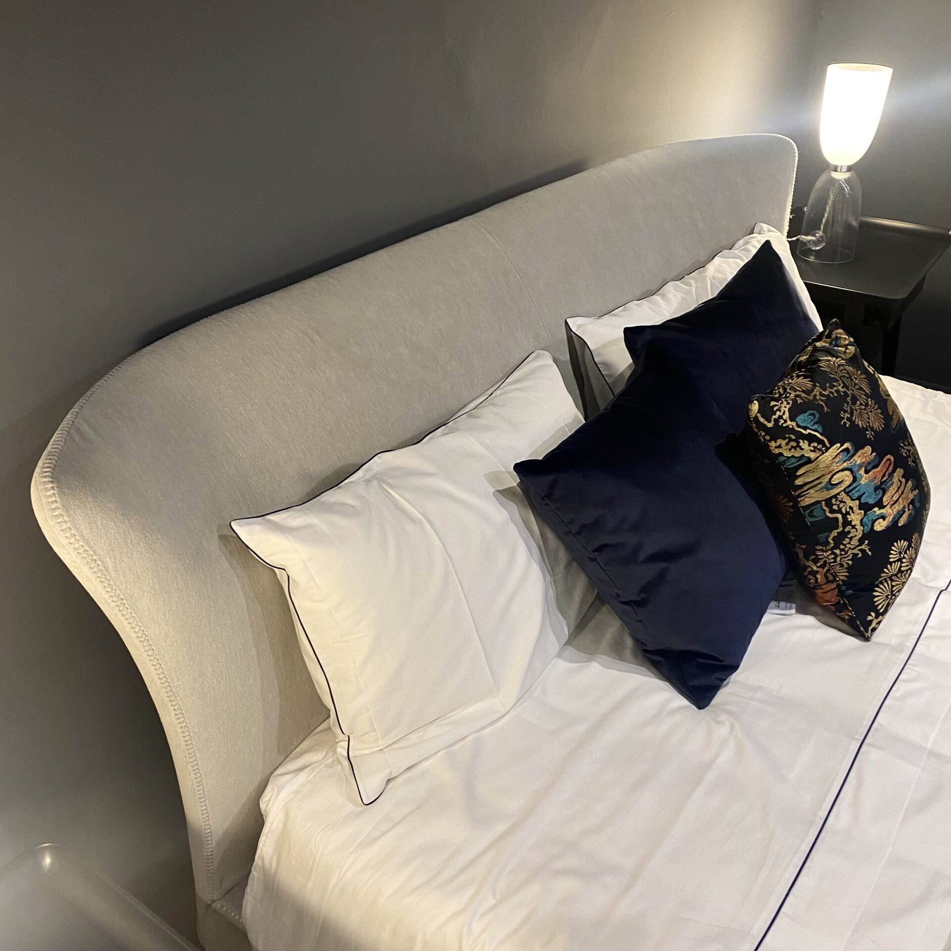 Rivestito in tessuto Licata finitura Sasso con cuciture a contrasto in filo bianco.