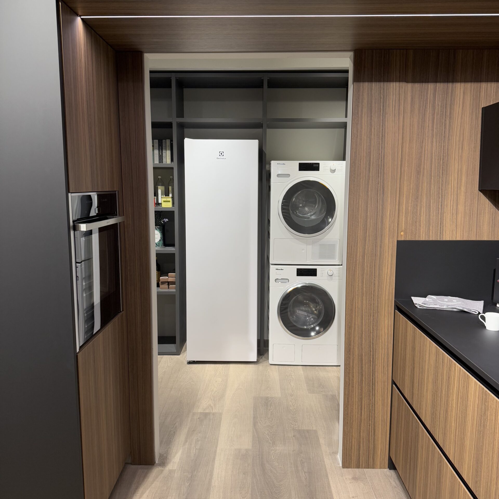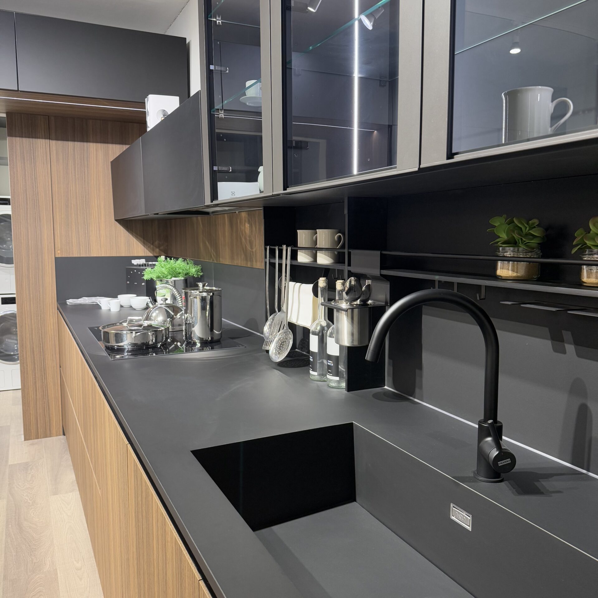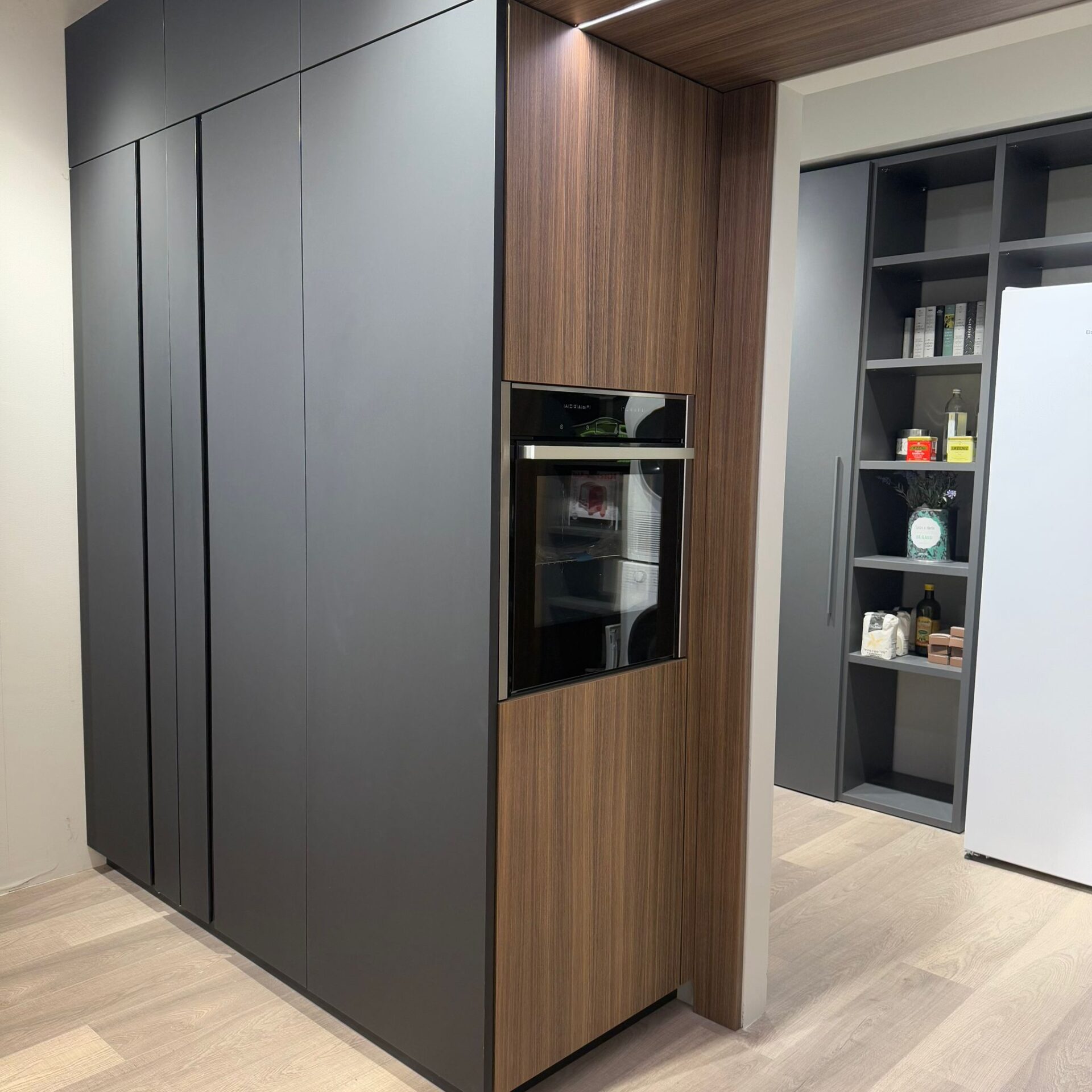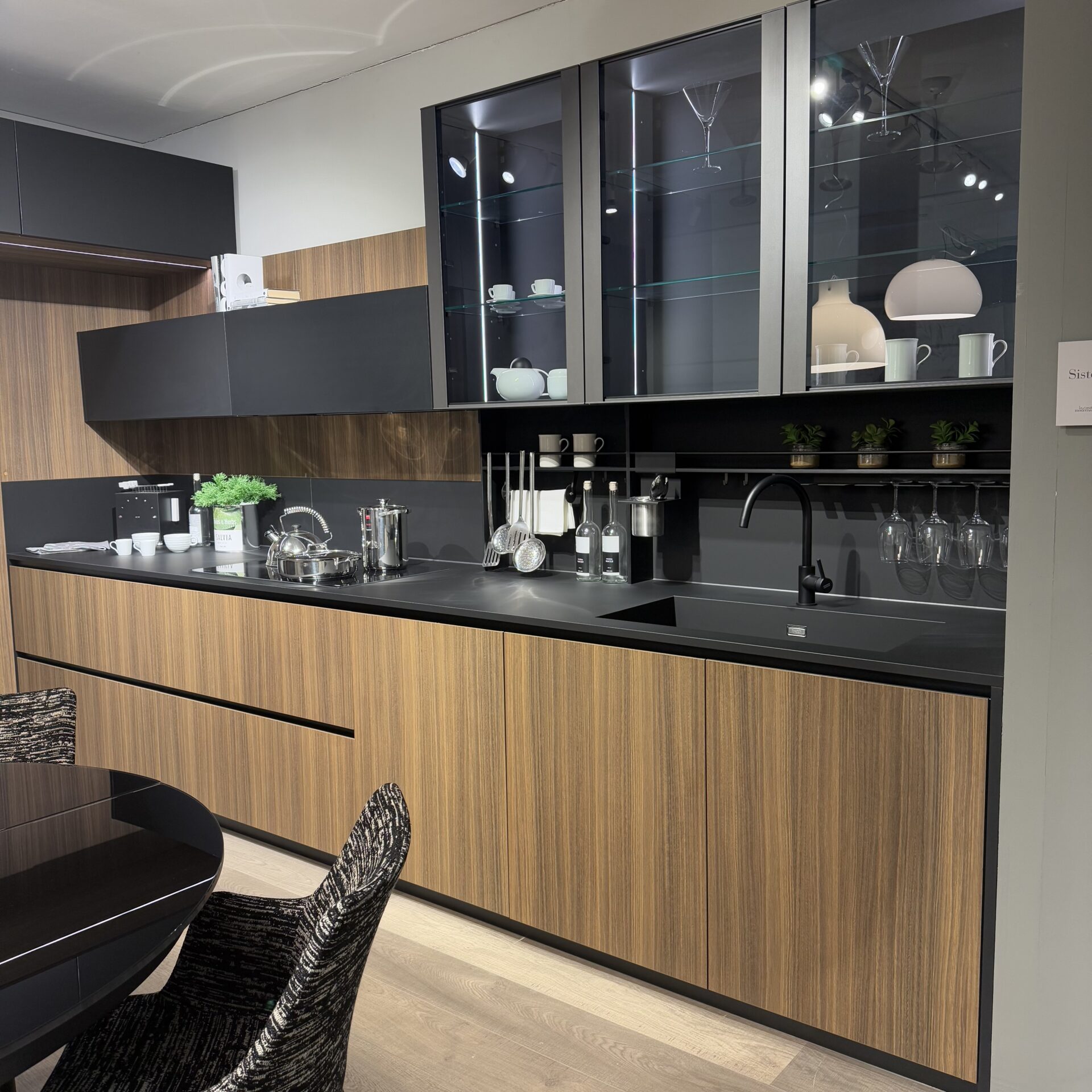 Cucina modello Lamina Tratto finitura Eucaliptus Tabacco con frontali neri.